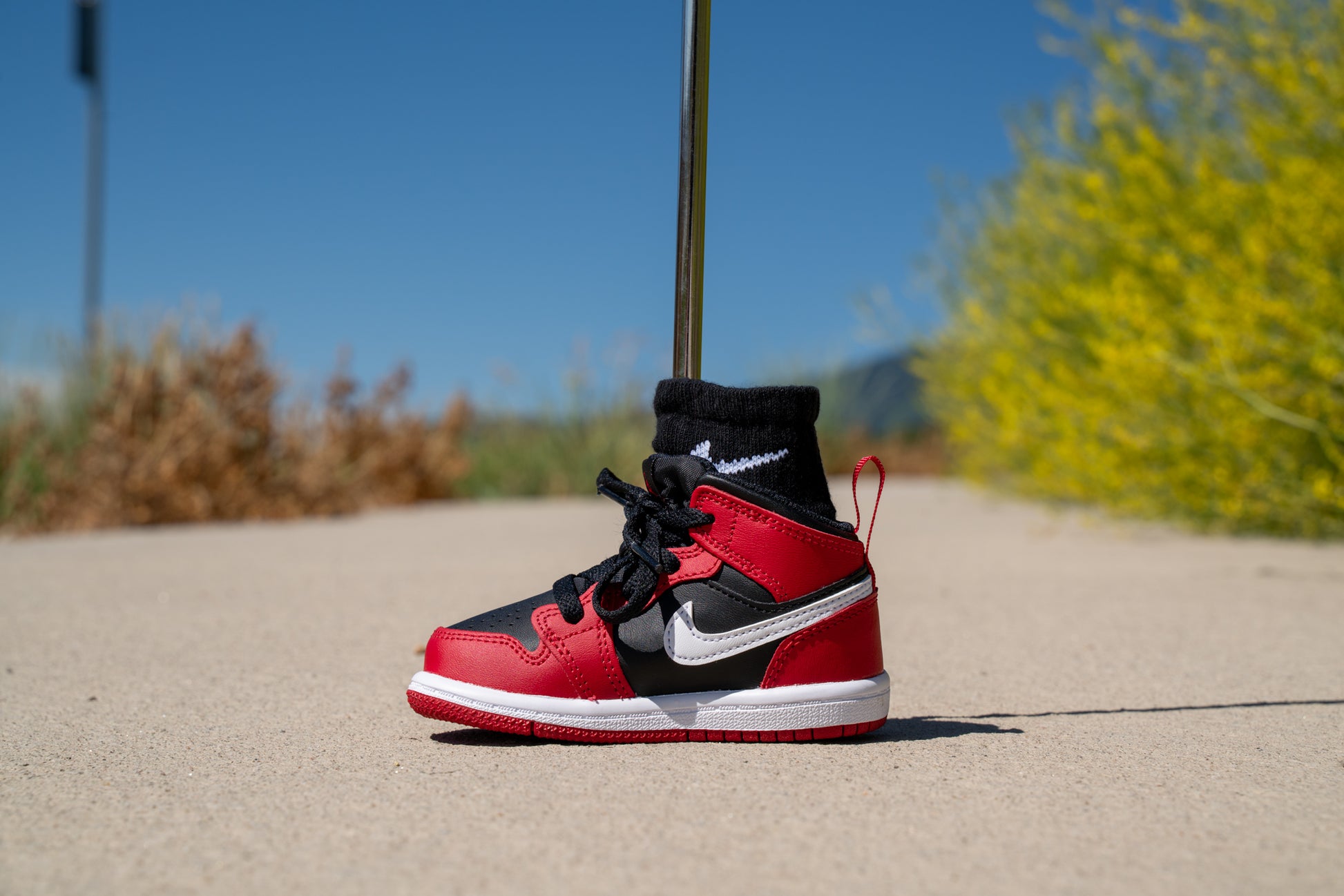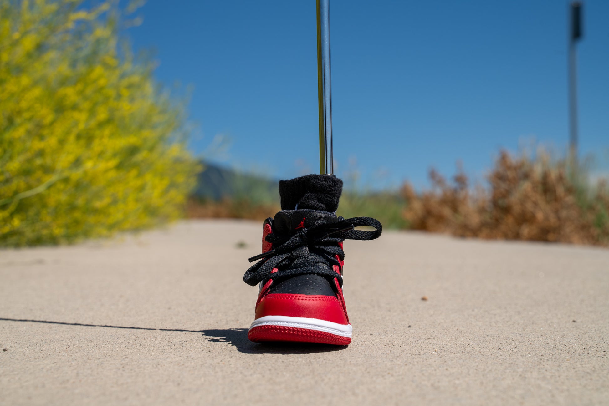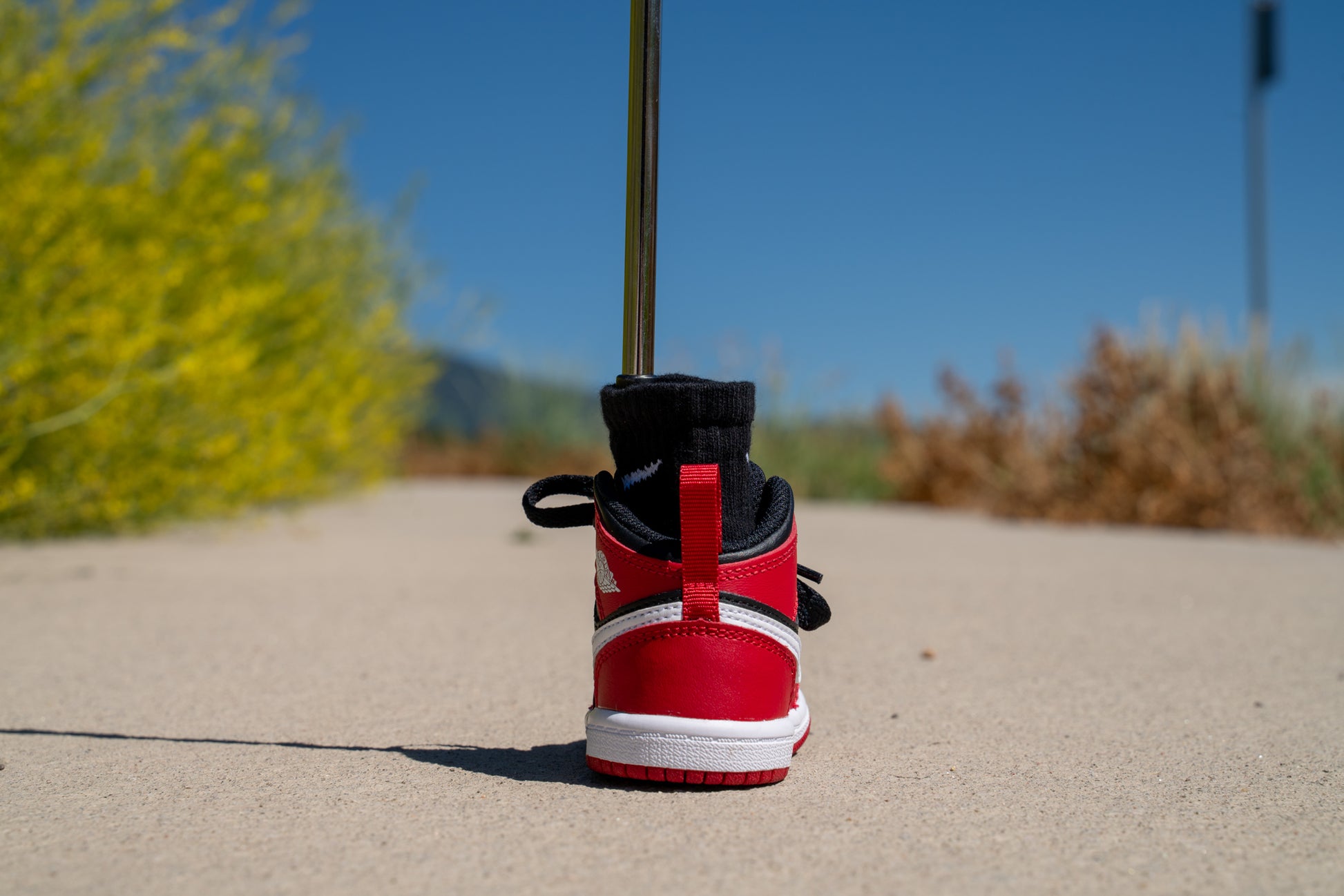 Elevate your golf style with the Jordan 1 Mid [GYM RED 25] standing sneaker putter cover. Setting itself apart from other shoe putter covers, ours stands upright, making a bold statement on the putting green.